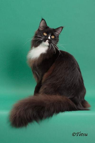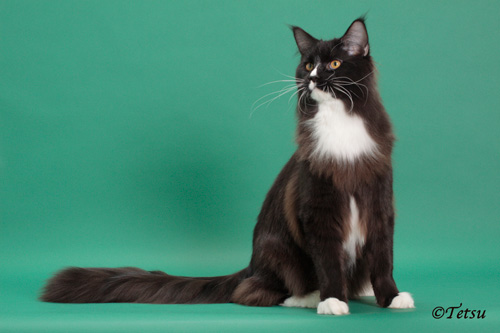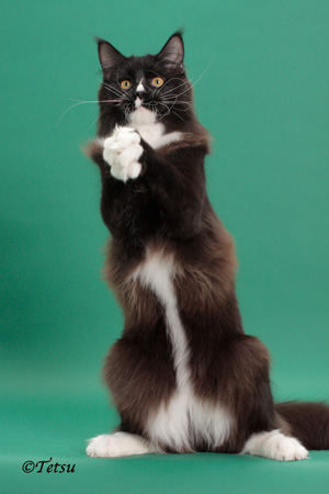He was shown in TICA during the 2008-2009 show year and ended up as the 12th Best Allbreed Kitten and 4th Best Maine Coon Kitten Internationally. He was also the 2nd Best Kitten in the Mid-Atlantic Region after MTNest Princess Diana. He was shown for less than 2 months as an adult before the end of the show year and was the 16th Best Allbreed Cat in our region. During the show year 2009-2010, he was BEST Cat in the MA Region and 7th Best Cat Internationally. Thanks to Phillipa Holmes of Noracoon Maine Coons from Bexhill On Sea, United Kingdom, Violet Elizabeth lived with us since the breeding, going through her pregnancy and delivery, after which she became a U.S. citizen.