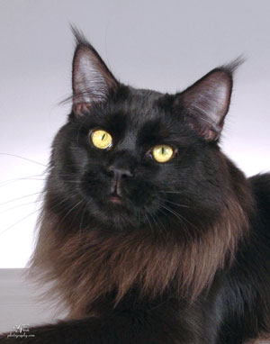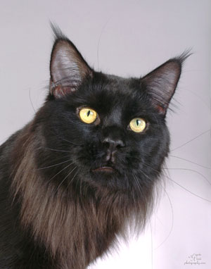Nemo is solid black, quite large and has a wonderful personality. In the show year 2006-2007, he was the Best Maine Coon Cat and 3rd Best Championship Cat Internationally. He was also the Best Championship Cat in the Mid-Atlantic Region. Since his show days are past, he has been breeding and has sired many litters of lovely kittens.