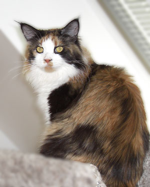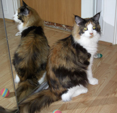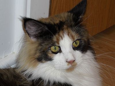 Violet came to live with us in April 2008 (after being shown during the show year 2007-2008 and becoming an International Winner) to be bred to IW SGC MTNest Nevermore. After being bred, her owner at the time, Phillipa Holmes of Noracoon Maine Coon Cats, suggested that she remain at our house to deliver. After delivering her lovely kittens, Phillipa decided to let her stay with us. We are so excited to have her as a member of our breeding family. How lucky we were and will be forever grateful to Phillipa for allowing us to adopt such a gorgeous girl.